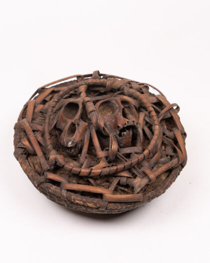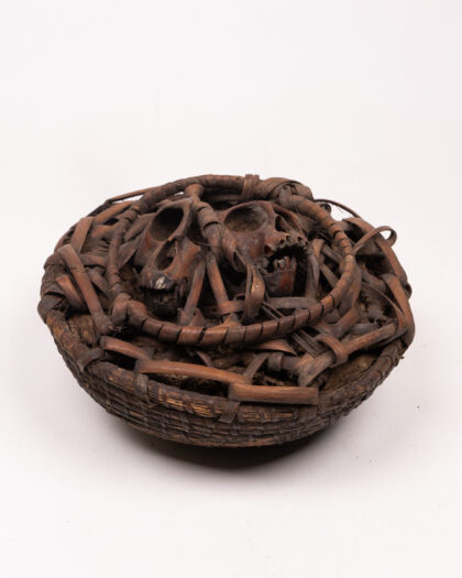 Unique woven basket featuring the skulls of monkeys. The basket is constructed from natural woven material. Two monkey skulls are incorporated into the design, adding an unusual decorative touch. The skulls are quite weathered and aged. Good condition considering age and use. Please review the images for more detail.