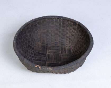 Vintage dark brown woven basket. Rounded edges, textured surface, crafted from natural material. The basket has an oval shape. It has a woven design. This basket can be used for decorative storage or as a standalone decor piece. Its age adds vintage charm. Good condition with some signs of wear consistent with age.