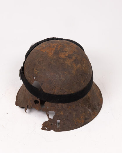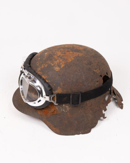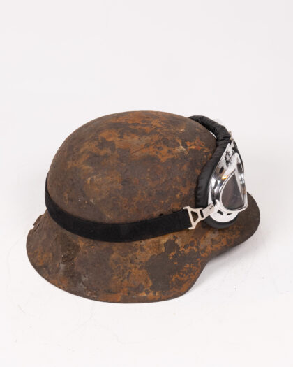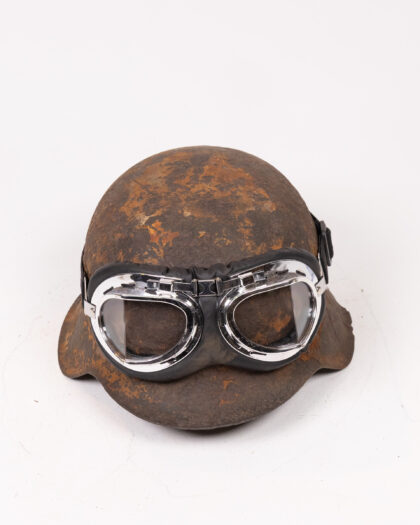 An original World War II German steel helmet. The helmet exhibits considerable age and wear, including rust and some damage, which enhance its authentic vintage charm. It is paired with accompanying goggles featuring glass lenses and a metal frame. Ideal for collectors of military memorabilia, history enthusiasts, or as a distinctive decorative piece. The helmet shows how it survived through the war and gives a rustic vintage feel.