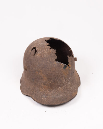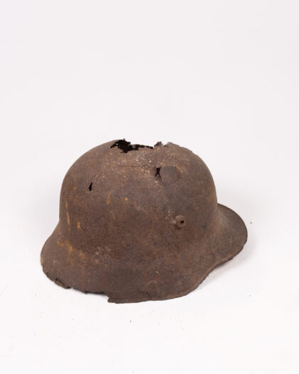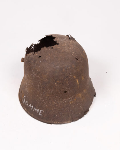 This is an original World War I German M1916 Stahlhelm (steel helmet). It is made of steel, and painted brown and grey. The helmet has a large hole in the top. The word 'Somme' is written on the side in white paint. This helmet would make an interesting historical item and a great talking point.