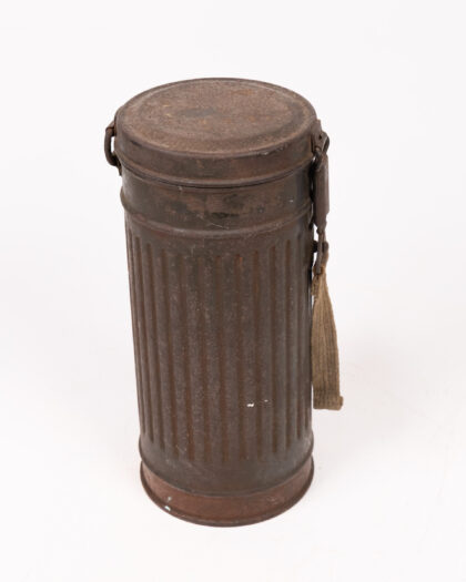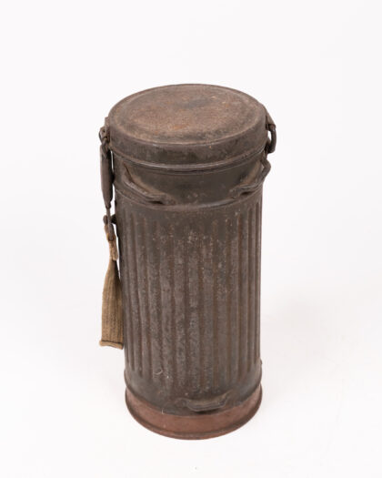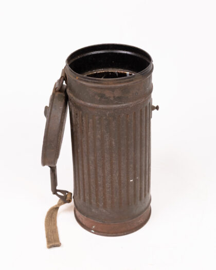 This is a vintage German WWII gas mask canister, most likely from the mid-20th century. The canister is made of metal and features a ribbed cylindrical design with a hinged lid and a fabric carrying strap. It shows signs of age and wear, including surface rust and discoloration. This canister is a great piece for collectors of military memorabilia or for adding a unique, industrial touch to your home decor. The interior is black. The lid is hinged with a metal latch.