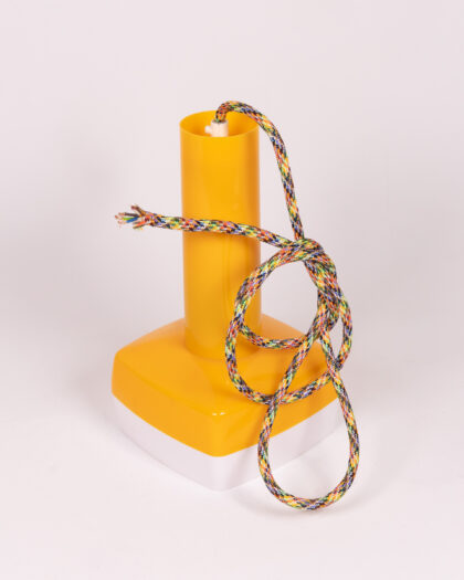 Retro plastic ceiling light fixture in yellow and white. Unique braided cord adds character.