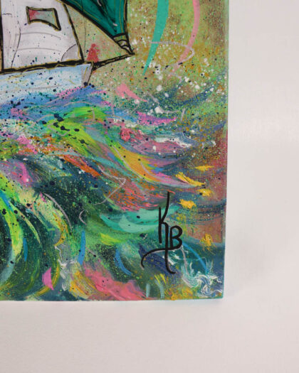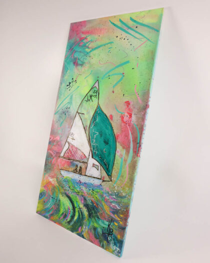This is an original sailboat painting by Irish artist Kate Broderick. The artwork features a sailboat at sea, rendered in a vibrant and colourful style. The artist uses a mix of brushstrokes and splatters to create a dynamic and energetic composition. The dominant colours include green, pink, and blue, creating a cheerful and lively atmosphere. The painting is on canvas and framed in wood. It is in new condition, signed by the artist. This painting would be a great addition to any living room, bedroom, or home office.