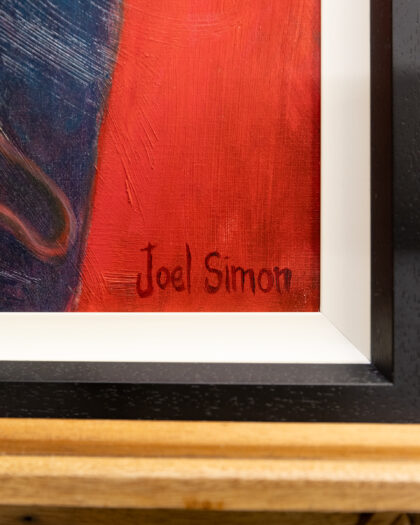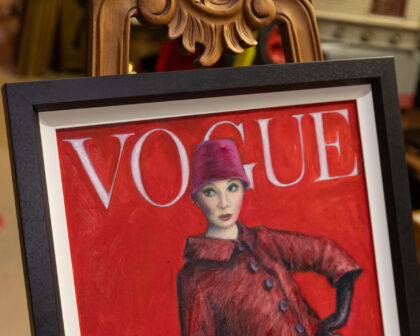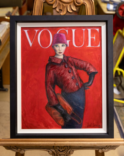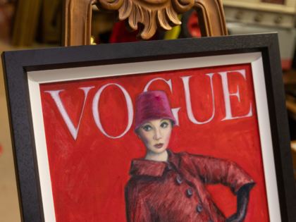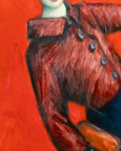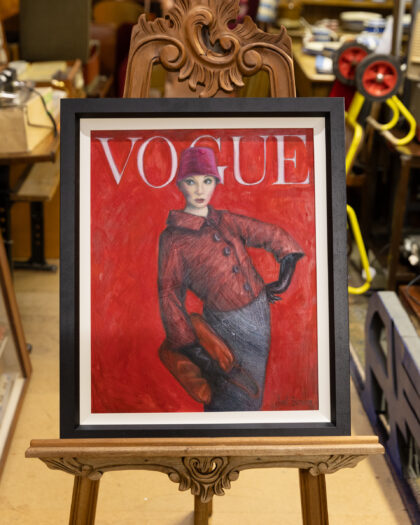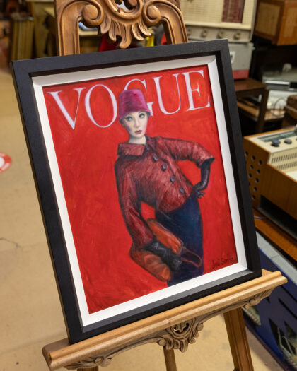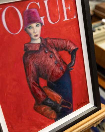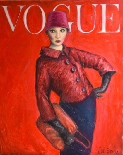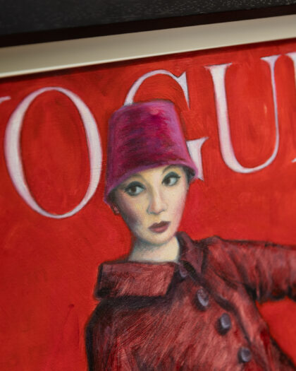 "This painting is an ode to the colour crimson, my favourite colour, based on an actual Vogue cover, the background is painted in loose impasto strokes which complement the woman’s strong and harmonious outlines."