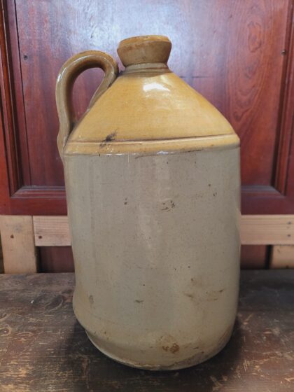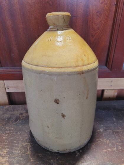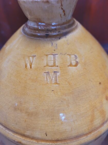 A brown two tone glazed stoneware flagon. Bears impressed marks, "W H B M".