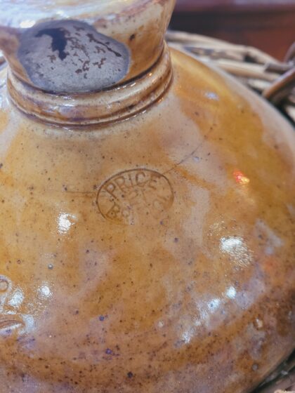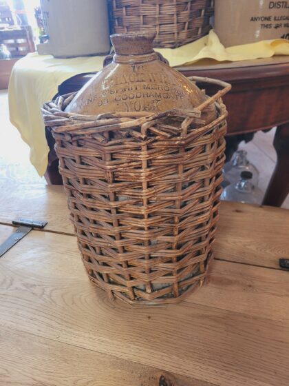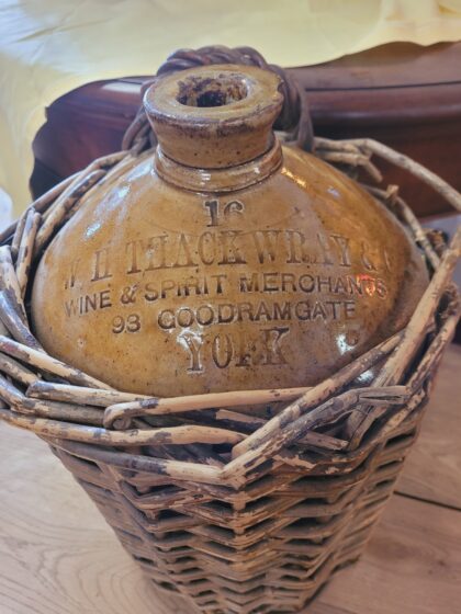 Brown glazed stoneware flagon in rattan casing with handle. Bears impressed lettering which reads, "W. H. Thackwray & Co. Wine & Spirit Merchants 93 Goodramgate York". Bears impressed Price Bristol makers mark.