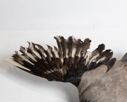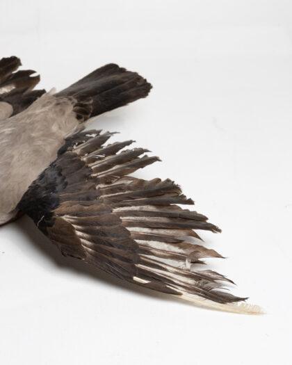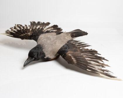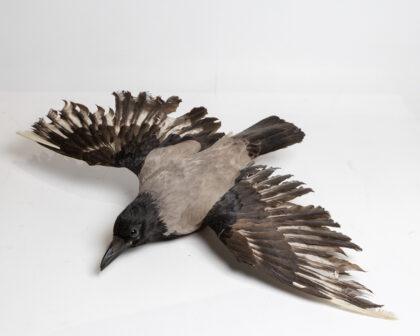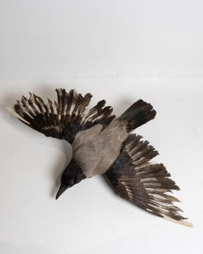 This taxidermy grey crow is a stunning representation of the species, featuring its characteristic grey and black plumage. The wings are spread to display the intricate feather patterns, showcasing an unnatural white along the feather shafts, an issue caused by malnutrition. Ideal for collectors or educational displays, this specimen is in excellent condition.