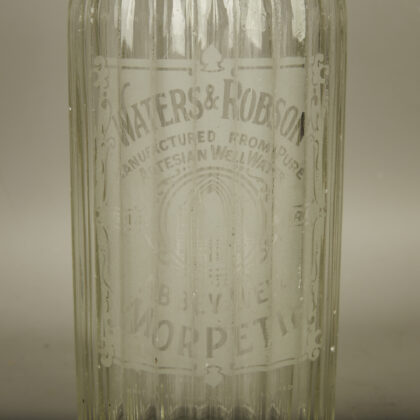 Bears etched lettering which reads, "Waters & Robson Abbey Well Morpeth Manufactured from Pure Artesian Well Water Trade Mark Regd.".