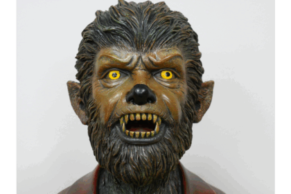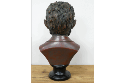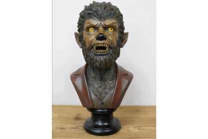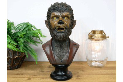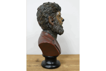 This werewolf bust is a striking piece of decorative art. The bust depicts a werewolf in a red suit jacket and grey waistcoat, adding an unexpected element of style to the monstrous figure. The werewolf's features are finely detailed, with piercing yellow eyes, sharp teeth, and realistic fur texture. The bust is mounted on a black stand, providing a stable base for display.