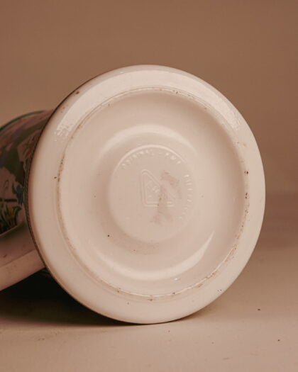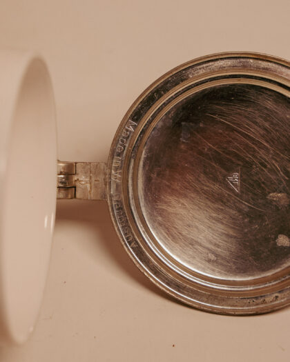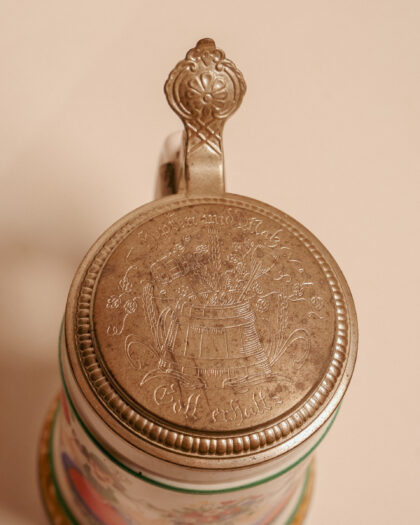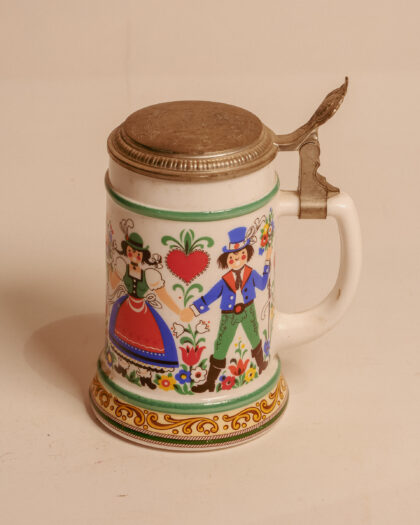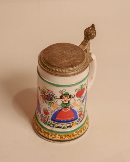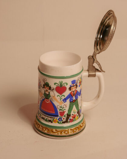 A milk glass beer stein made in West Germany with engraved lid.
