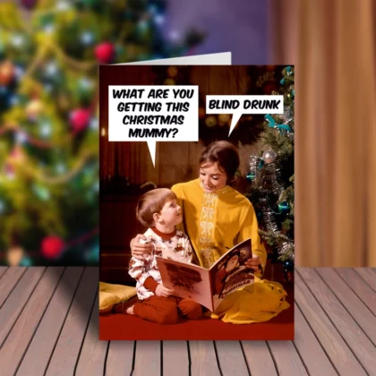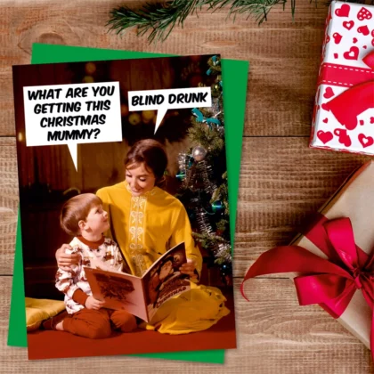 This humorous Christmas greeting card features a retro-style image of a mother and son reading a book. Speech bubbles add a witty twist, with the son asking, "What are you getting this Christmas Mummy?" and the mother replying, "Blind Drunk". The card is printed on quality paper stock and is ideal for spreading festive cheer to friends and family with a shared sense of humour. It is perfect for adding a touch of levity to the holiday season and is sure to bring a smile to the recipient's face. Comes with a green envelope.