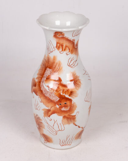 A striking vase featuring a distinctive foo dog design in red against a white background. The vase boasts a gracefully curved silhouette with a scalloped rim, adding a touch of elegance. Its clean lines and balanced proportions make it a versatile piece suitable for various interior styles. The vase is in excellent condition, with no visible cracks or chips, preserving its aesthetic appeal and structural integrity.