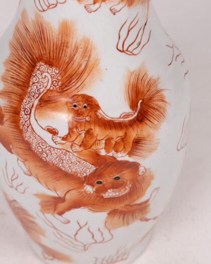 Elegant white ceramic vase with eye-catching red foo dog design. Ideal for adding a unique and decorative touch to any room. Excellent condition.