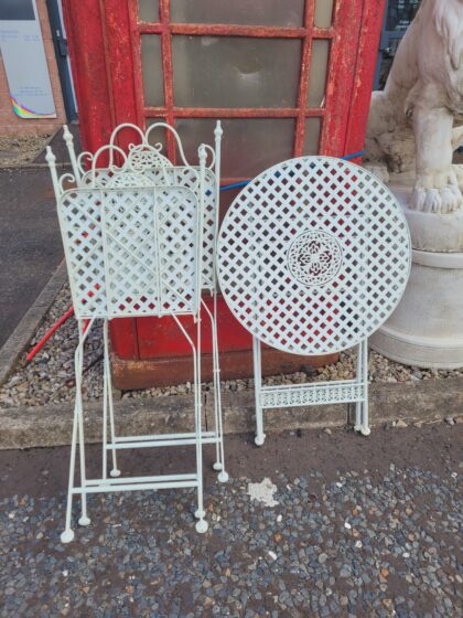 A folding set of a table and two chairs.