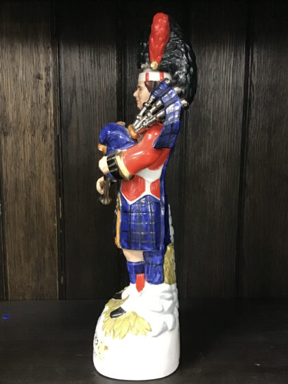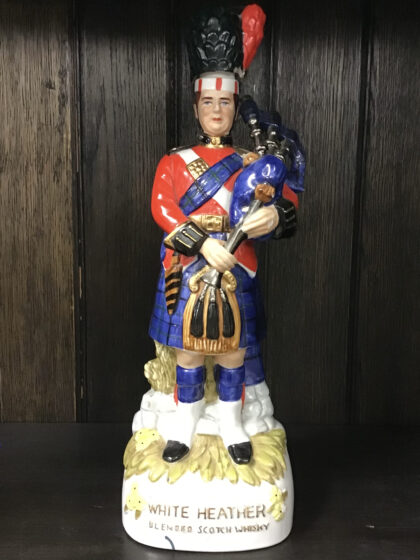 A glazed ceramic White Heather advertising statue in the form of a highlander. Created by Bond & Co. A piece of the bagpipes is missing as well as some other pieces of damage. Some breaks have since been mended. Features an applied paper label.
