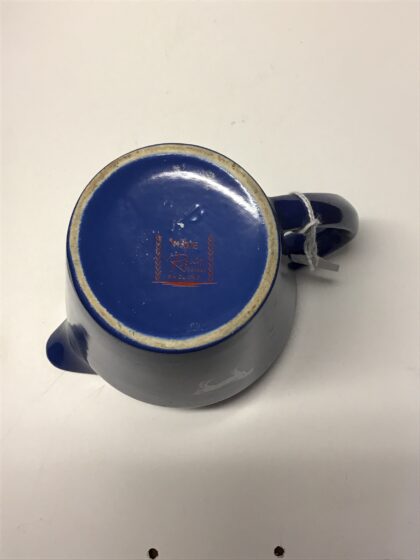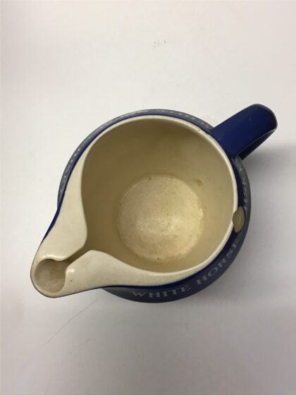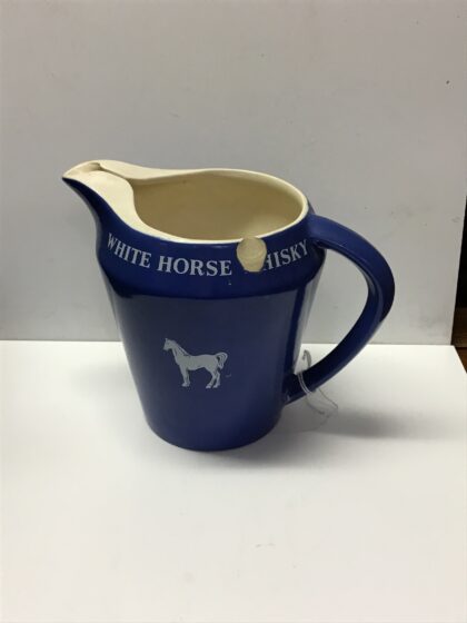 A blue glazed ceramic bartop water jug. Bears white lettering which reads, "White Horse Whisky". Made by Wade and bears red backstamp to base.