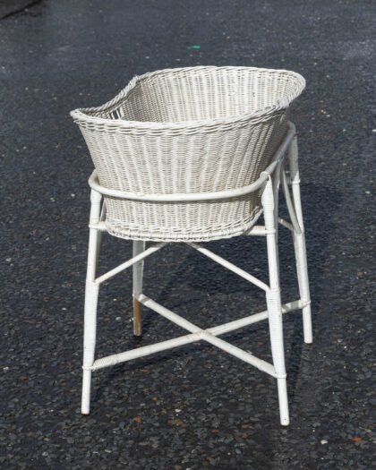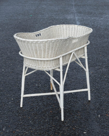 This is a vintage-style white wicker baby bassinet with a woven wicker bassinet and a sturdy stand. Its neutral colour palette makes it suitable for a variety of nursery decor styles. The bassinet is in good, used condition, with minor signs of wear typical of its age. Ideal for a nursery or an infant's bedroom, adding a touch of vintage charm and practicality.