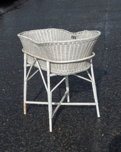 Vintage-style white wicker baby bassinet with stand. In good, used condition, perfect for a nursery or infant's bedroom.