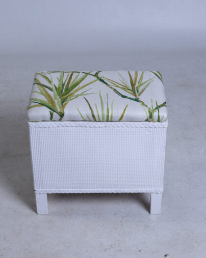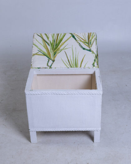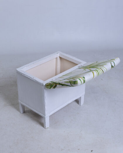 This is a wicker storage ottoman featuring a lift-up cushioned seat. The ottoman is constructed from woven wicker and painted white, creating a textured exterior. The seat is padded and upholstered with a fabric featuring a tropical leaf print in shades of green. The ottoman has short, square legs that elevate it slightly from the ground. The interior of the ottoman provides storage space.