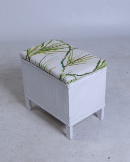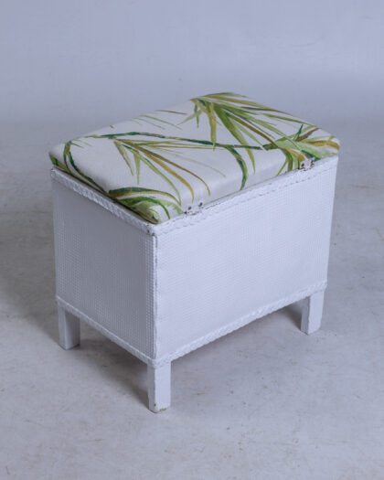 White wicker storage ottoman with tropical leaf patterned cushion. Lift-up seat reveals storage, perfect as extra seating or stylish storage solution.