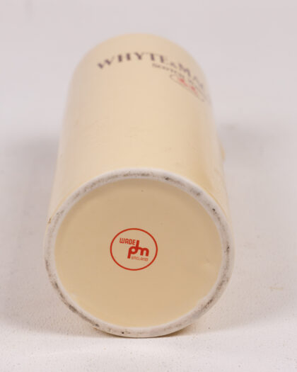 This is a Whyte & Mackay Scotch Whisky ceramic water pitcher/jug. The pitcher is cream coloured with dark brown lettering and a red emblem featuring two lions. It is marked on the base "Wade pm England". This is a vintage piece. It is in excellent condition with no chips or cracks. Ideal for adding a touch of vintage charm to your barware collection or as a unique gift for the whisky enthusiast.