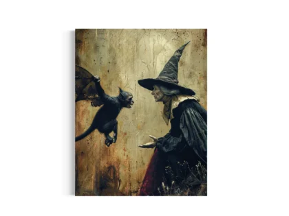 Embrace the iconic portrayal of the "Wicked Witch of the West" from "The Wizard of Oz" with our vintage movie poster. Unveil the darker corners of enchantment with this compelling print where a witch, dressed in a traditional black robe and tall pointed hat, interacts mysteriously with a winged creature. Set against a textured, aged backdrop, the witch extends her hand towards a small, fierce-looking flying monkey with outstretched wings. This powerful image evokes a sense of ancient magic and secretive dialogues, perfect for those who are fascinated by the mythical and the mystical.