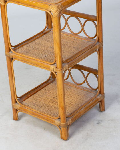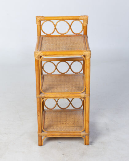 This charming bamboo and wicker shelving unit features a classic three-tier design, perfect for displaying decorative items or providing practical storage solutions. The open design allows for easy access and adds a light, airy feel to any space. Its neutral colour complements a variety of decor styles, making it a versatile addition to your home. In good condition, with some minor wear consistent with age and use. A beautiful piece to add a touch of natural style to any room.