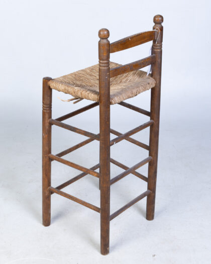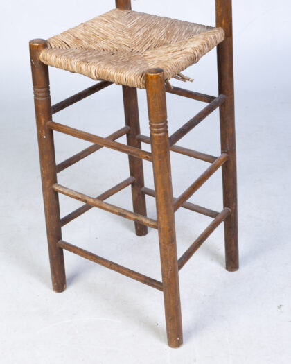 This is a charming wooden stool with a woven seat. The stool has a rustic, vintage look, with a dark brown finish on the wood and a natural, woven seat. It features a square seat with a back. The stool appears sturdy and well-made, though some signs of wear and tear might be present, adding to its vintage character. Ideal for a rustic-themed kitchen or dining area, this stool offers both style and functionality.