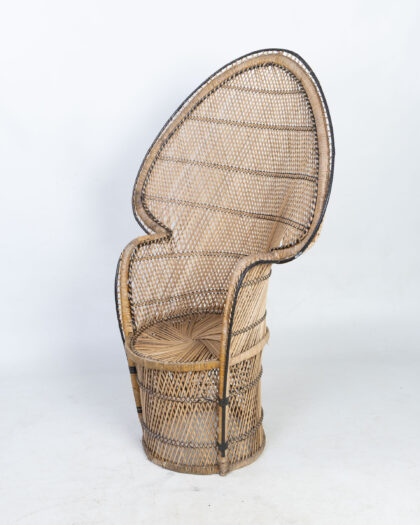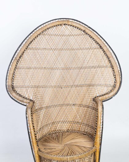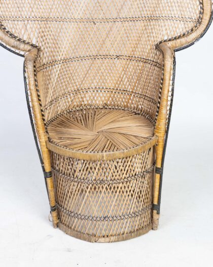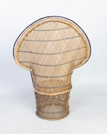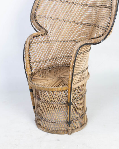 This distinctive peacock chair is crafted from natural wicker and features a high, fan-shaped back. The wicker is woven in a lattice pattern with black accents outlining the chair's form, adding visual definition. This vintage chair has a rounded seat, providing a comfortable sitting experience. It is a statement piece, perfect for adding a touch of bohemian style to any room. The chair is structurally sound, though it may show some signs of wear commensurate with age. It is a wonderful blend of comfort and dramatic design. A truly eye-catching piece.