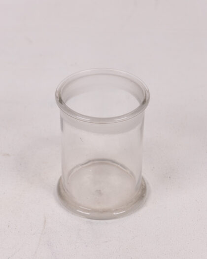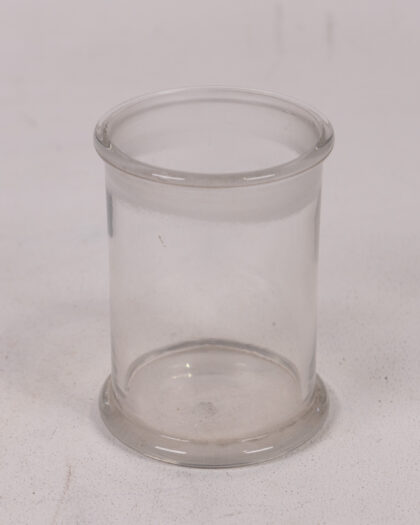 A clear glass chemist specimen jar. This would have originally had a lid but the lid is no longer present. The glass is clear and without major chips or damage. There are some slight marks and signs of use. It is of a cylindrical shape with a clear, smooth finish. A great piece for any collector of pharmaceutical items.