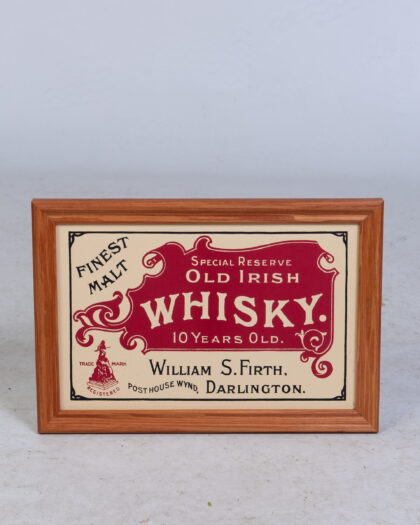 This is a framed print advertising Old Irish Whisky. The print is in a wooden frame and features a red and cream design with black lettering. The print reads "Finest Malt Special Reserve Old Irish Whisky. 10 Years Old. William S. Firth, Posthouse Wynd, Darlington." The frame is in good condition with only minor wear and tear. A charming vintage piece of advertising.