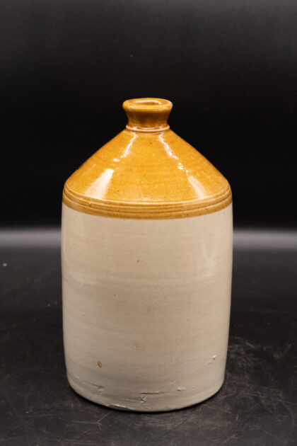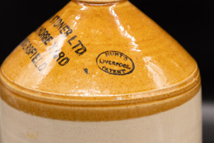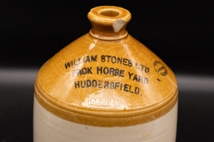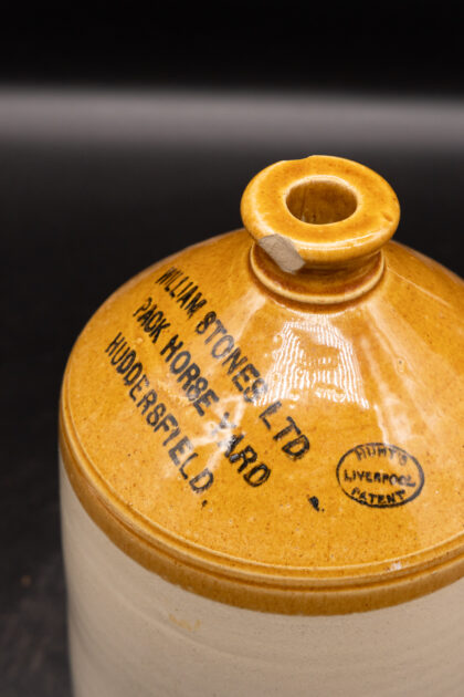 A large stoneware flagon bearing black lettering which reads, "William Stones Ltd Pack Horse Yard Huddersfield". Bears printed "Hunt's Liverpool Patent" marking. There are two chips to the lip.