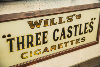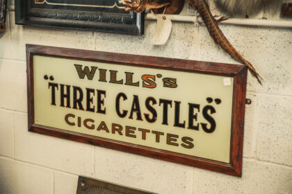 A framed antique mirror which a local artist has backpainted with specialist paints and 24 carat gold leaf. Reads, “Wills’s “Three Castles” Cigarettes”.