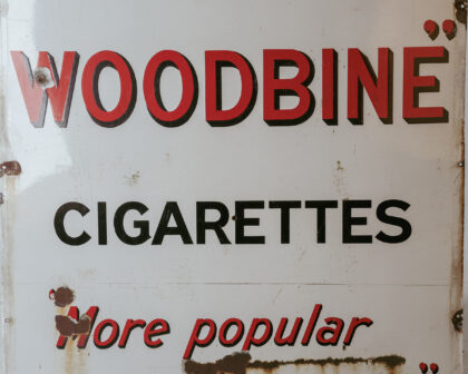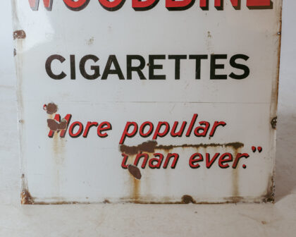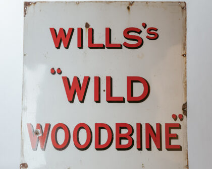 A very large white enamel advertising sign with red and black lettering which reads, "Wills's "Wild Woodbine" Cigarettes "More popular than ever."".