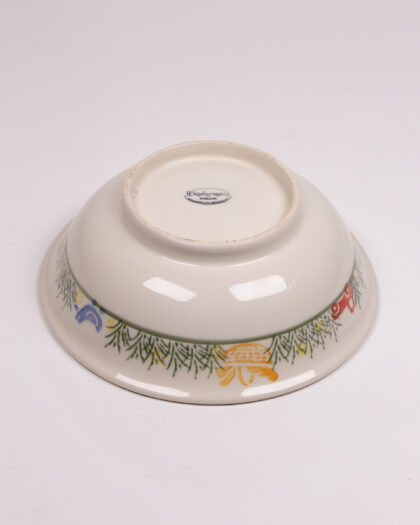 This Windermere bowl features a delightful hand-decorated scene of teddy bears playing with a kite, surrounded by a field of flowers. The central design is bright and cheerful, perfect for a child's room or for adding a touch of whimsy to any dining setting. The base of the bowl features the Windermere England mark. The bowl itself is cream, with floral patterns around the outer rim and a decorative edge with green pine needle style images. The overall condition is very good, with no visible chips or cracks, though there may be minor signs of wear consistent with age and use.