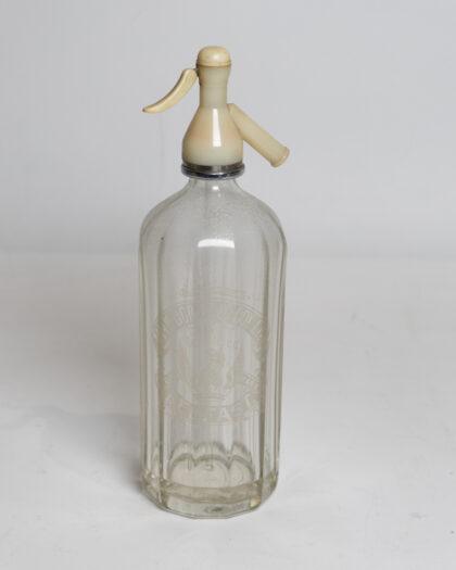 A classic vintage glass soda siphon bottle with etched branding. Ideal for collectors or as a decorative piece.