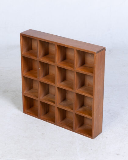 This versatile shelving unit features a classic design with a warm brown finish. Constructed from sturdy wood, the unit offers sixteen individual compartments, perfect for displaying small collectibles. Its compact size makes it ideal for use on a desk, shelf, or wall-mounted display. The unit is in good condition, with only minor signs of wear and tear that add to its character. This shelving unit offers both practical storage and aesthetic appeal, making it a charming addition to any room.