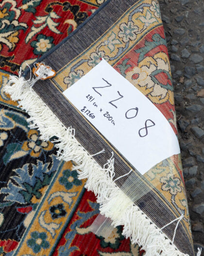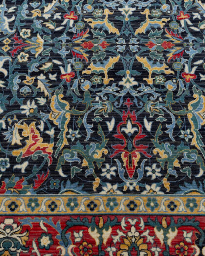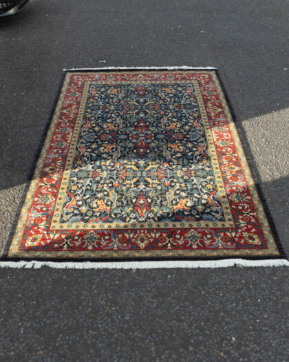 Intricate Persian style wool rug with a floral pattern and multiple borders in shades of black, red and gold. Excellent condition.