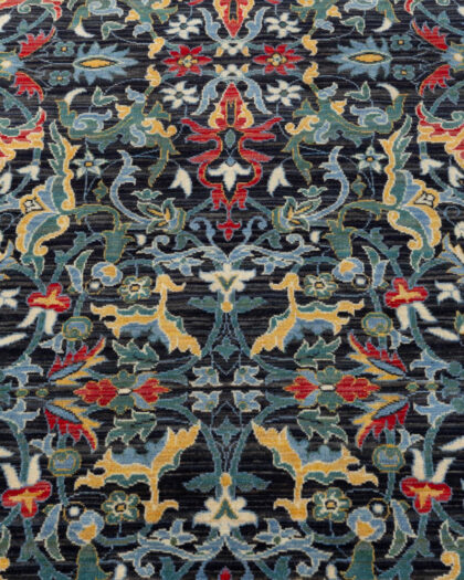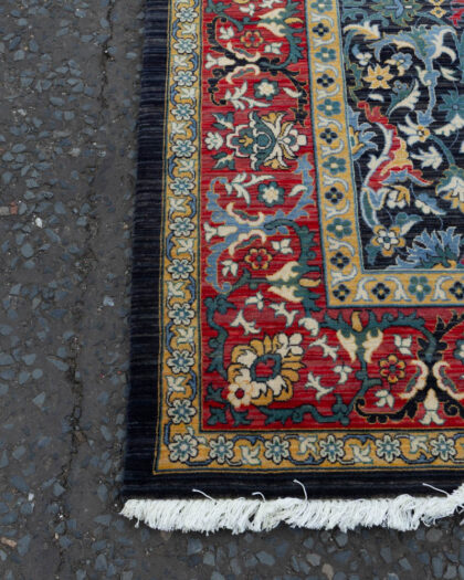This is a decorative Persian style wool rug with an intricate floral pattern. It features a central black field filled with symmetrical floral and foliate designs in red, gold, and blue. The rug has multiple borders in red and gold floral designs, finished with fringed edges. It is in excellent condition. The rug would be suitable for a variety of rooms and decors.