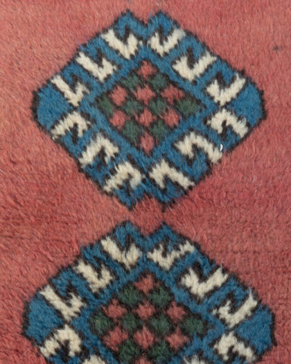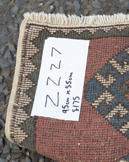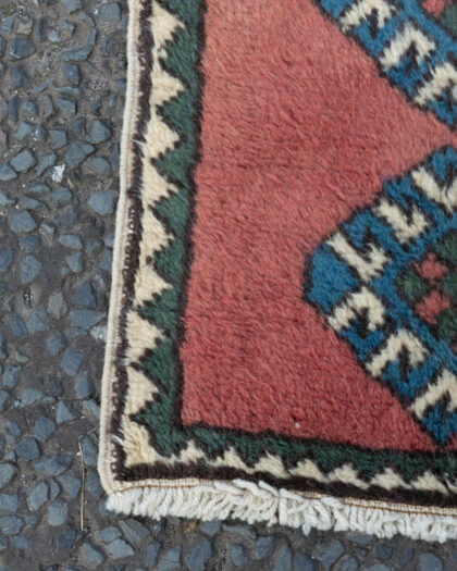This small accent rug features a bold geometric pattern in red, blue and green. The rug is constructed from a soft, short pile wool and features a red centre and geometric diamond patterns, with accents of green. Edged with a beige border and fringed ends.