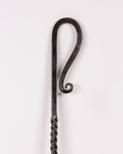 This hand-forged fire poker is made from sturdy wrought iron. It features a distinctive twisted shaft and a looped handle with a decorative curl. Perfect for tending to your fireplace, adding a touch of rustic charm to your fireside experience. In excellent condition.