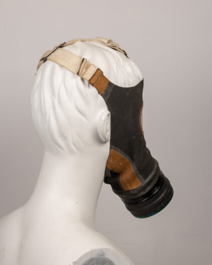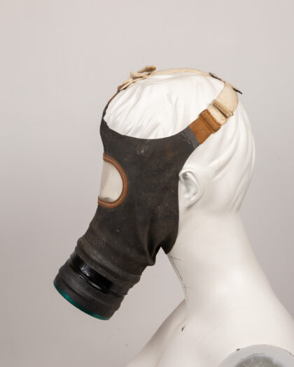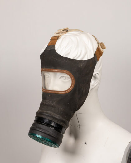 Original vintage gas mask, likely from World War II era. The mask is constructed from black rubberized material with a metal and green filter attached at the front. Features adjustable straps for a secure fit. The mask shows signs of age and wear, including some dust and discoloration, consistent with its age and use. 'LOT 1057 K' is stamped on the front. A great military collectible or display piece.