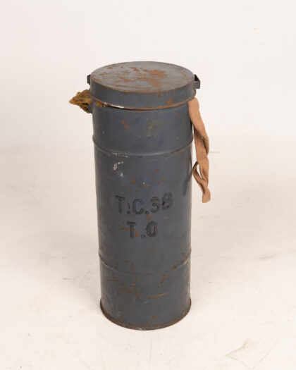 Original WWII French civilian gas mask with its storage canister. The mask features a tan fabric face covering with dual clear eye pieces, a rubberized olive green filter, and adjustable straps. The canister is cylindrical, painted a grey-blue, and marked "T.C.38 T.O" in stamped lettering. Some wear and rust commensurate with age. An interesting piece of military history and collectible item. Mask is stuffed to display properly.