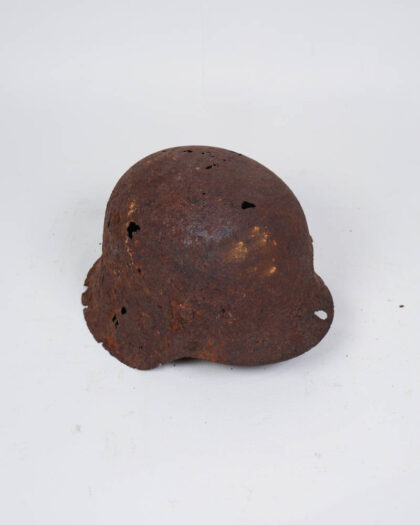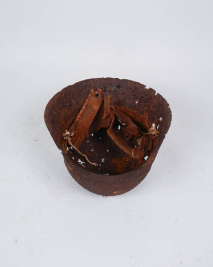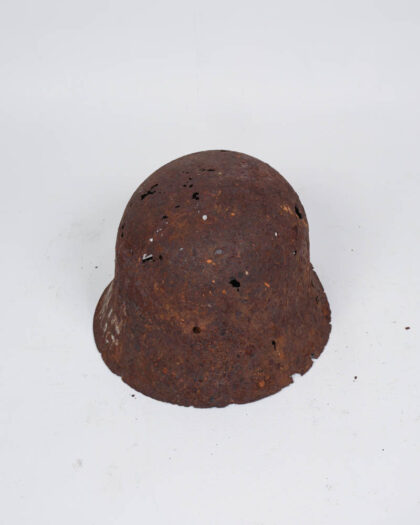 Heavily rusted steel helmet with remnants of a leather liner. Features painted marking. A unique military collectible.