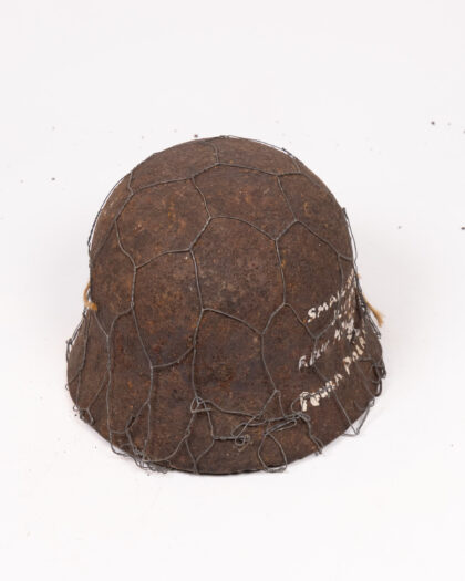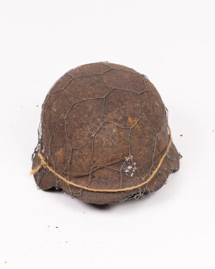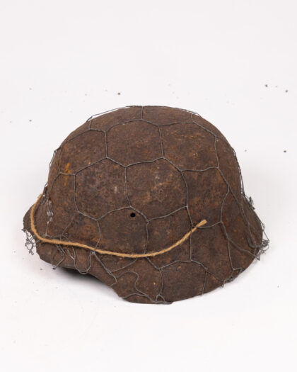 Original WWII German helmet with chicken wire. Relic condition, signs of age and wear. Display piece for military collections.