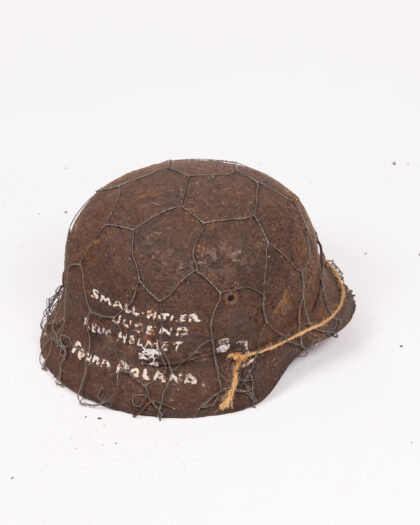 This is an original WWII German helmet. The helmet shows signs of age and wear commensurate with its age and use. The exterior shows significant rusting and has chicken wire attached. A previous owner has written on the item. This is a genuine historical artifact perfect for display. A unique display item for the history or military buff.