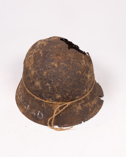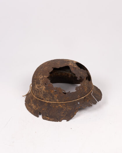 WWII relic German Stahlhelm helmet, inscribed 'Stalingrad'. Heavily damaged, showing significant wear and rust. A poignant historical artefact.