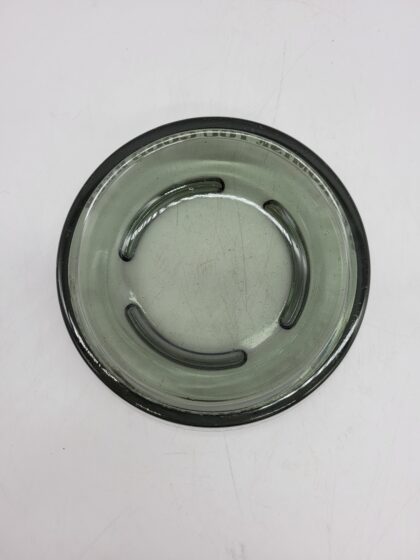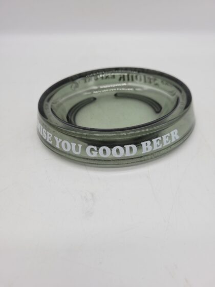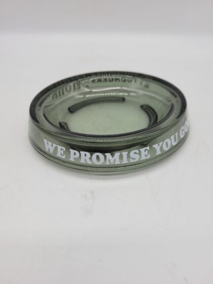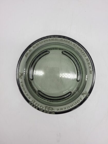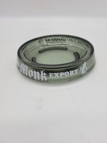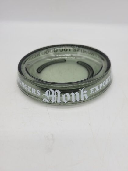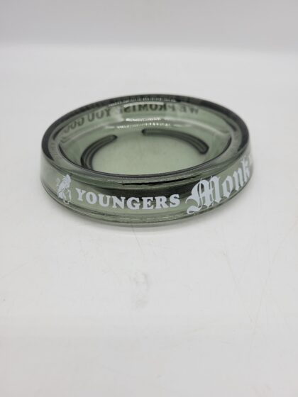A circular grey glass ashtray. Bears white lettering which reads, "Youngers Monk Export We Promise You Good Beer".