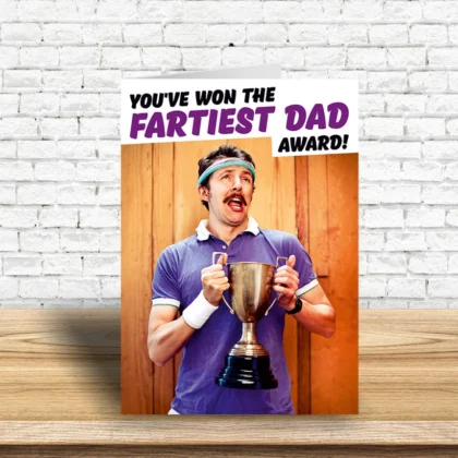 A Fathers Day card with a retro styled picture of a man holding a football style winners cup. Text above in a white box reads You've won the fartiest Dad award.