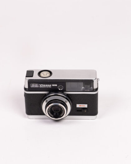 Vintage Zeiss Ikon Voigtlander Vitessa 126 Electronic camera with original black plastic case. Produced in West Germany. Features a Novar-Anastigmat 2.8/42 lens. The camera is in good cosmetic condition. The case shows some minor wear consistent with age. A unique piece of photographic history. Perfect for collectors.